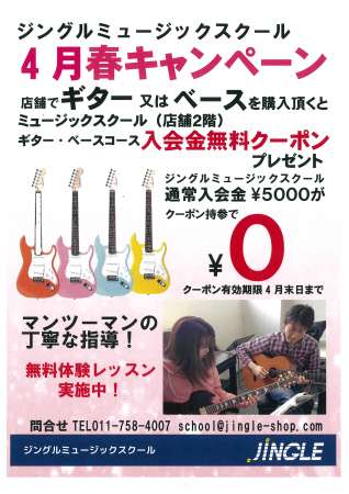 > 4月スクールキャンペーン ギター・ベースを店舗で購入すると入会金無料クーポンがもらえる!