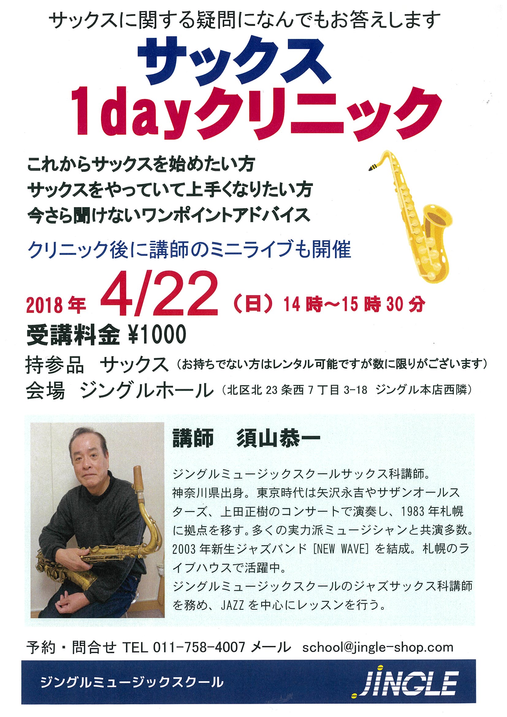 - 2018.3.9 school4/22(日)サックス1DAY クリニック開催
